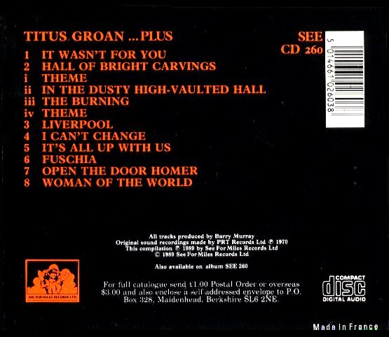 Reissued as "Titus Groan: Plus" (See For Miles SEE 260/SEE CD 260, 1989) containing three tracks from their single.