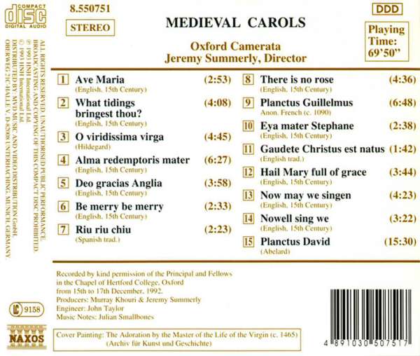 The most common type of carol is that relating to Christmas. The examples offered here are 'What tidings bringest thou?', 'Now may we singen', and 'Nowell sing we'. Not so overtly joyful but equally optimistic is 'Alma redemptoris mater' whose verses poetically paint the scenes of the Annunciation, Nativity, Crucifixion, and Resurrection respectively. After the Christmas carol the next in order of popularity was the Marian carol as represented here by 'Ave Maria', 'There is no rose', and 'Hail Mary full of grace'. In these settings the melodies are fluid and the harmonies subtle in order to portray the Virgin Mary as tender and graceful. Additionally the lives of the saints were frequently the subject of carols, none more robust than 'Eya mater Stephane' in honour of the martyrdom of St Stephen. By contrast the carol 'Be merry be merry' rejects specific subject matter altogether in favour of allusions to the many glories of Christian life as a means to universal happiness. Most memorable of all is 'Deo gracias Anglia' which recounts the defeat of the French by the English at the battle of Agincourt. King Henry sails to Normandy, takes the town of Harfleur by siege, wins the day at Agincourt, and drags the surviving French noblemen back to London; all this, of course, in the name of Almighty God. In a more popular style are the two Christmas carols 'Riu riuchiu' and 'Gaudete Christus est natus'. Spanish and English respectively they are catchy traditional medieval melodies whose refrains were harmonized in the early Renaissance.